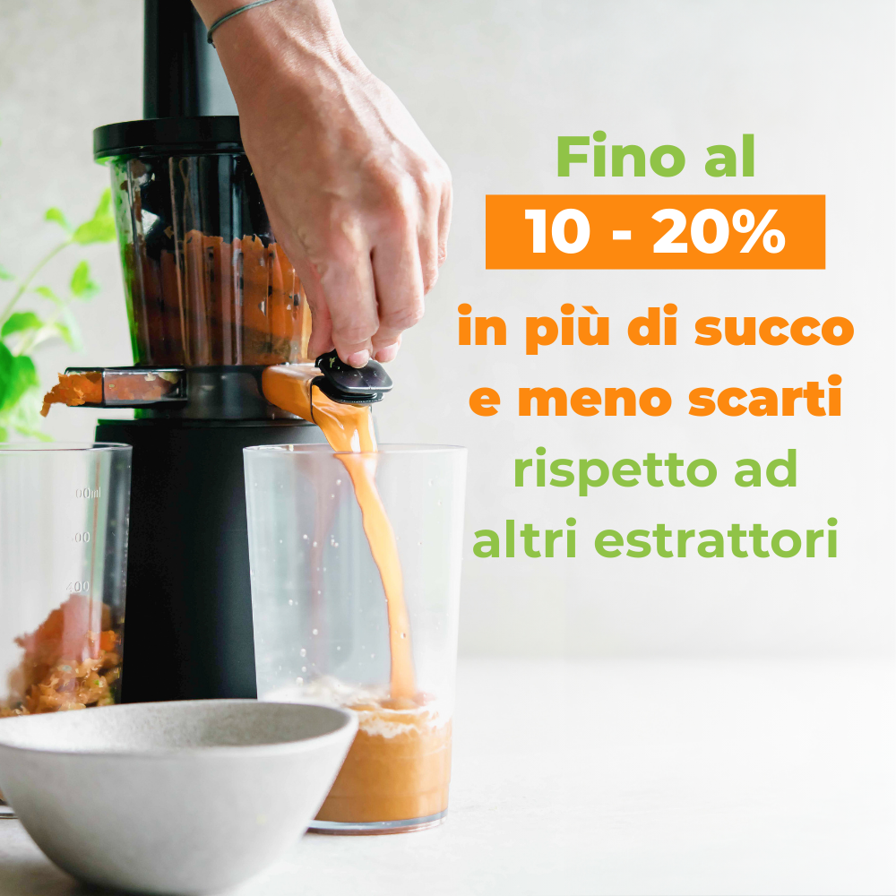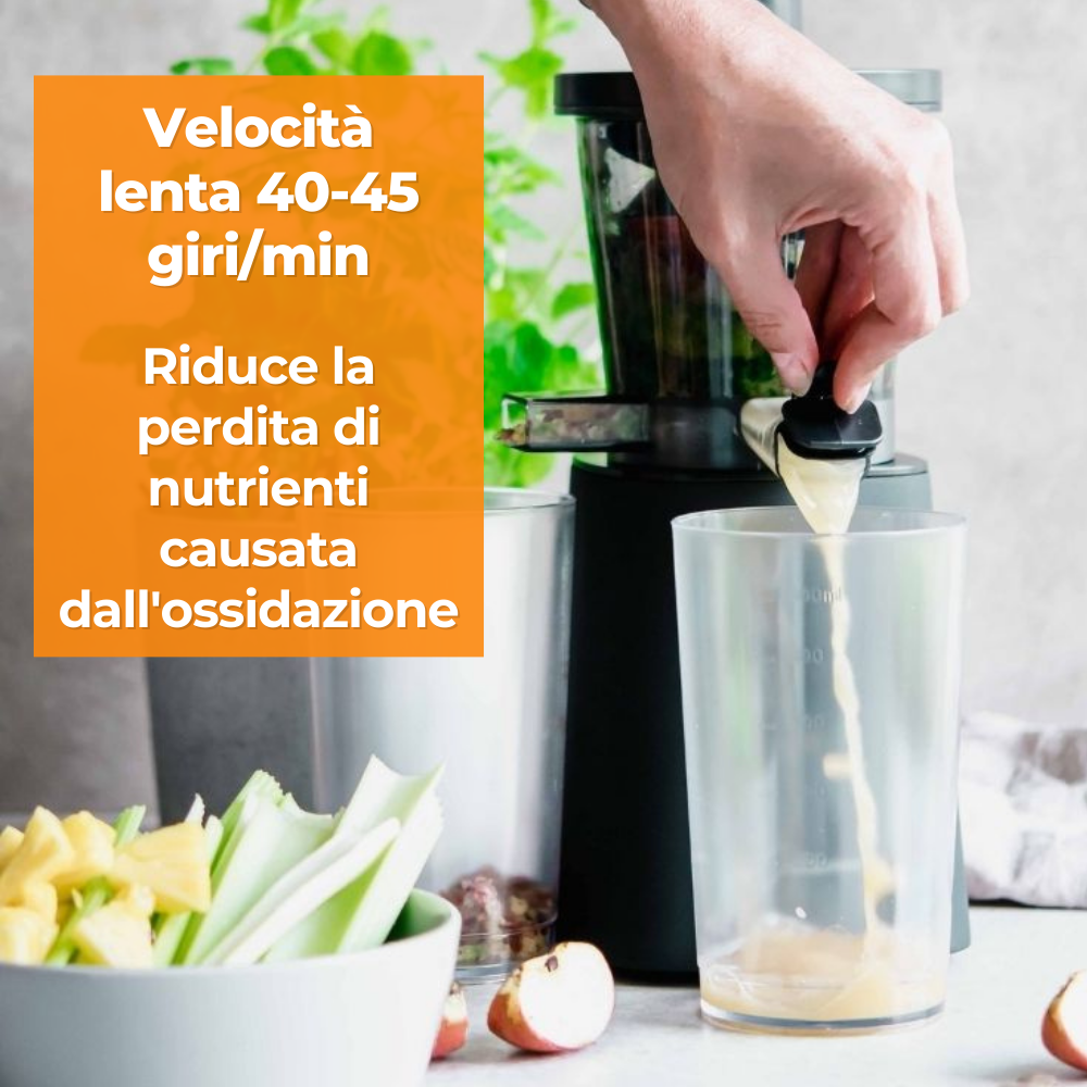 MASSIMIZZA IL TUO SUCCO: Bassa velocità di 40-45 giri/min per la massima conservazione dei nutrienti + 10% - 20% di succo in più e meno polpa rispetto a tutti gli altri estrattori