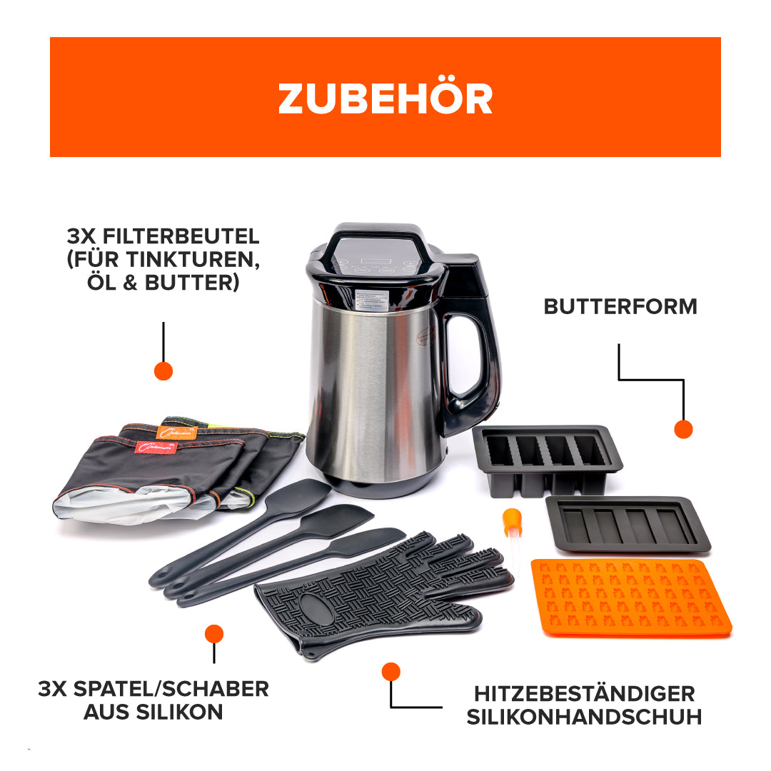 | Accessori: | Parti prive di BPA. Bicchiere per succo (600ml), bicchiere per polpa (600ml), pestello, coclea per estrattore, filtro fine (setaccio), piastra liscia (per fare sorbetti), spazzola per la pulizia, libro di ricette per estrattore, manuale d'uso |