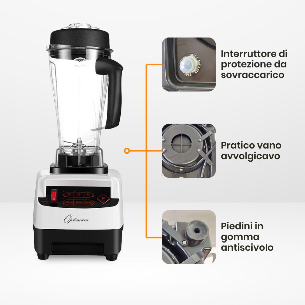 Motore proprietario a spazzole di carbonio efficiente e duraturoL'esclusivo motore di Optimum varia il consumo di energia in base alla potenza richiesta. Ciò consente al frullatore di superare la maggior parte dei concorrenti, senza alcun problema.