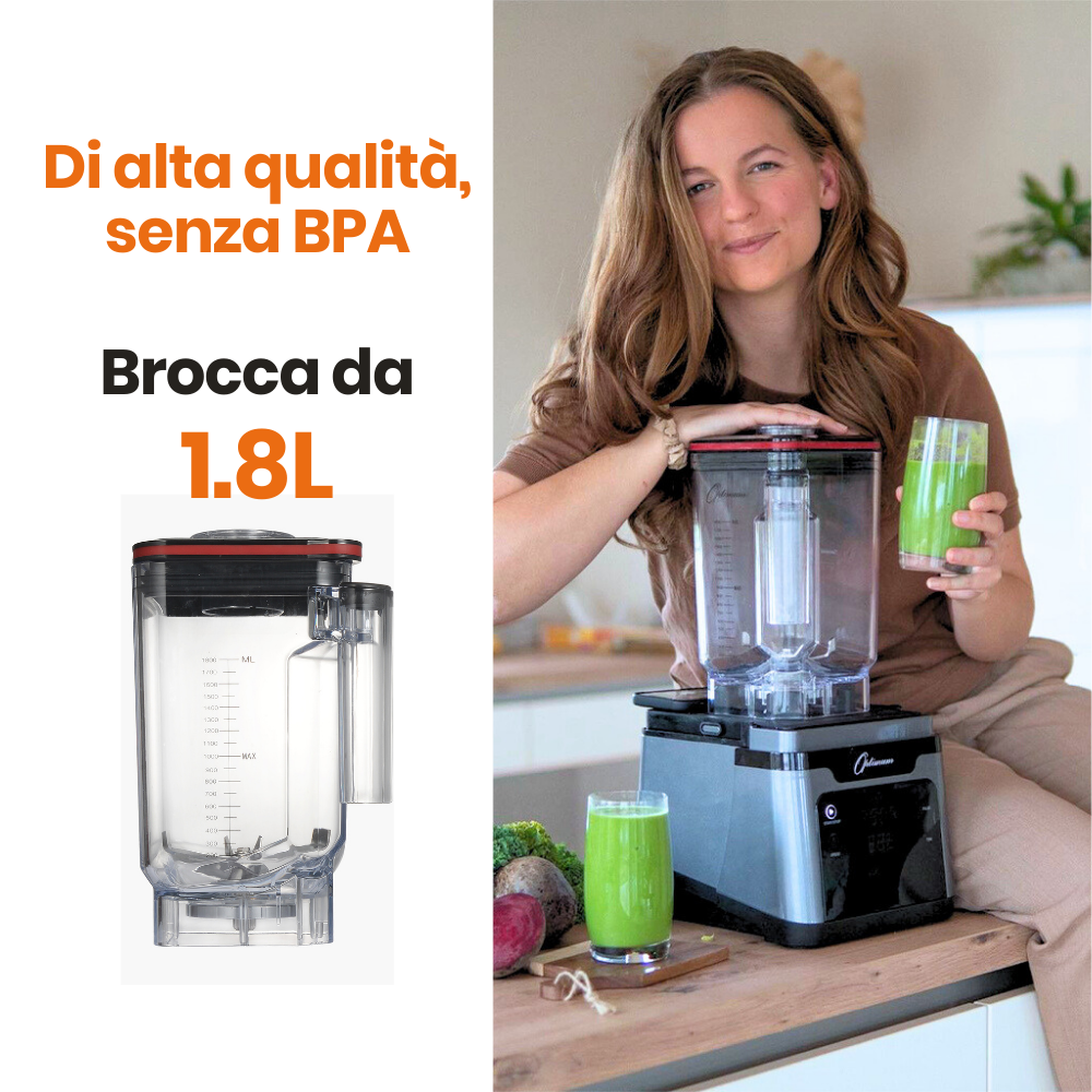 - Accessori: Contenitore da 1,8 litri senza BPA con coperchio e tappo di chiusura, pestello ad alte prestazioni per migliorare la lavorazione e la miscelazione (senza BPA) + manuale del prodotto e libro di ricette di 124 pagine