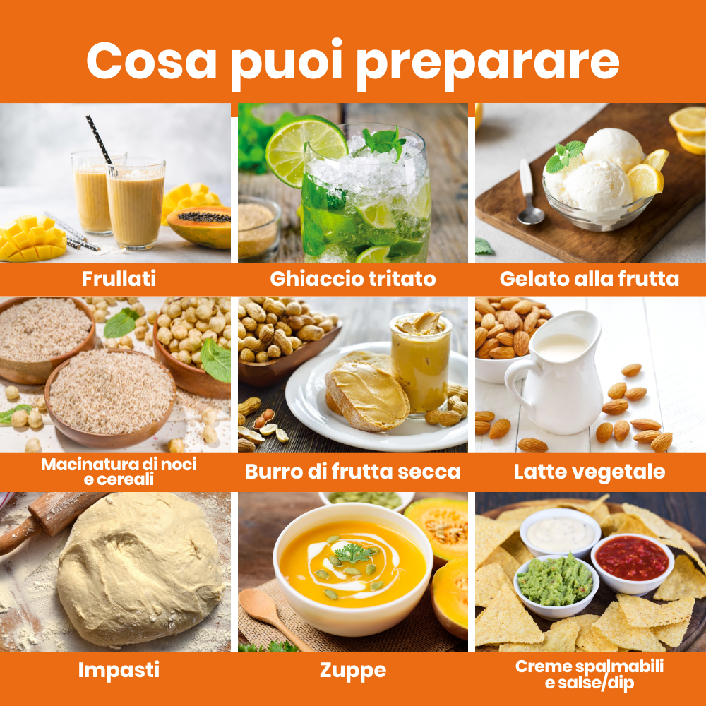Può frullare, tritare, lavorare, mescolare e riscaldare gli alimenti. Le lame in acciaio inox possono tagliare praticamente di tutto, dalle mandorle al formaggio. Prepara panna montata, burro di mandorle e persino Gelato con l'utensile da cucina definitivo che rende più facile la preparazione degli alimenti.