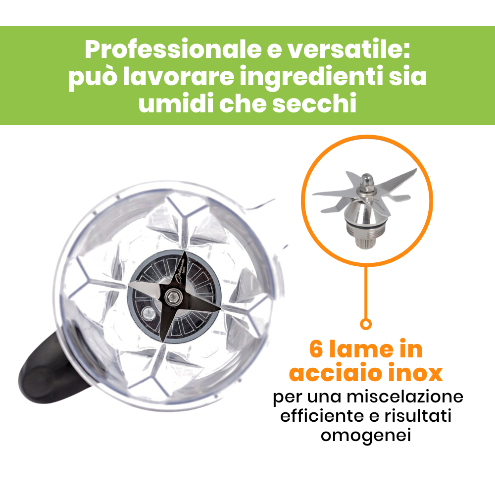 - Opzione di frullatura automatica per frullati (frulla automaticamente per un periodo di tempo prestabilito, perfetto per i bar di succhi di frutta e per le persone sotto stress; 20, 30 & 45 secondi)