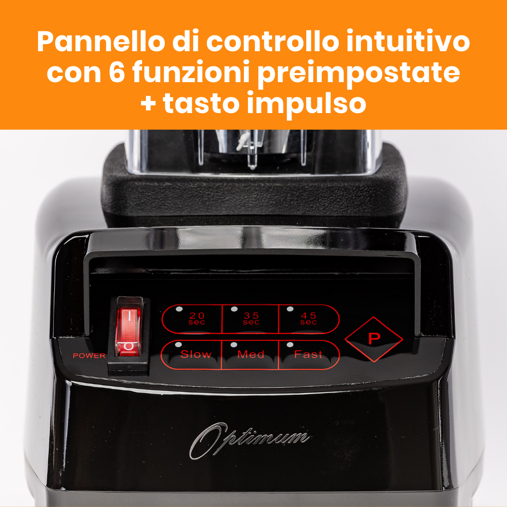 Motore proprietario a spazzole di carbonio efficiente e duraturoL'esclusivo motore di Optimum varia il consumo di energia in base alla potenza richiesta. Ciò consente al frullatore di superare la maggior parte dei concorrenti, senza alcun problema.